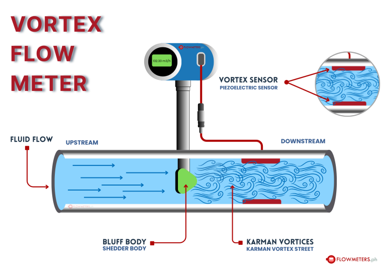 A Vortex flow meter measures flows of liquids, gases and steam by sending the frequency at which vortices are alternately shed from a bluff body. The frequency at which the vortices are alternately shed is directly proportional to the flow velocity.